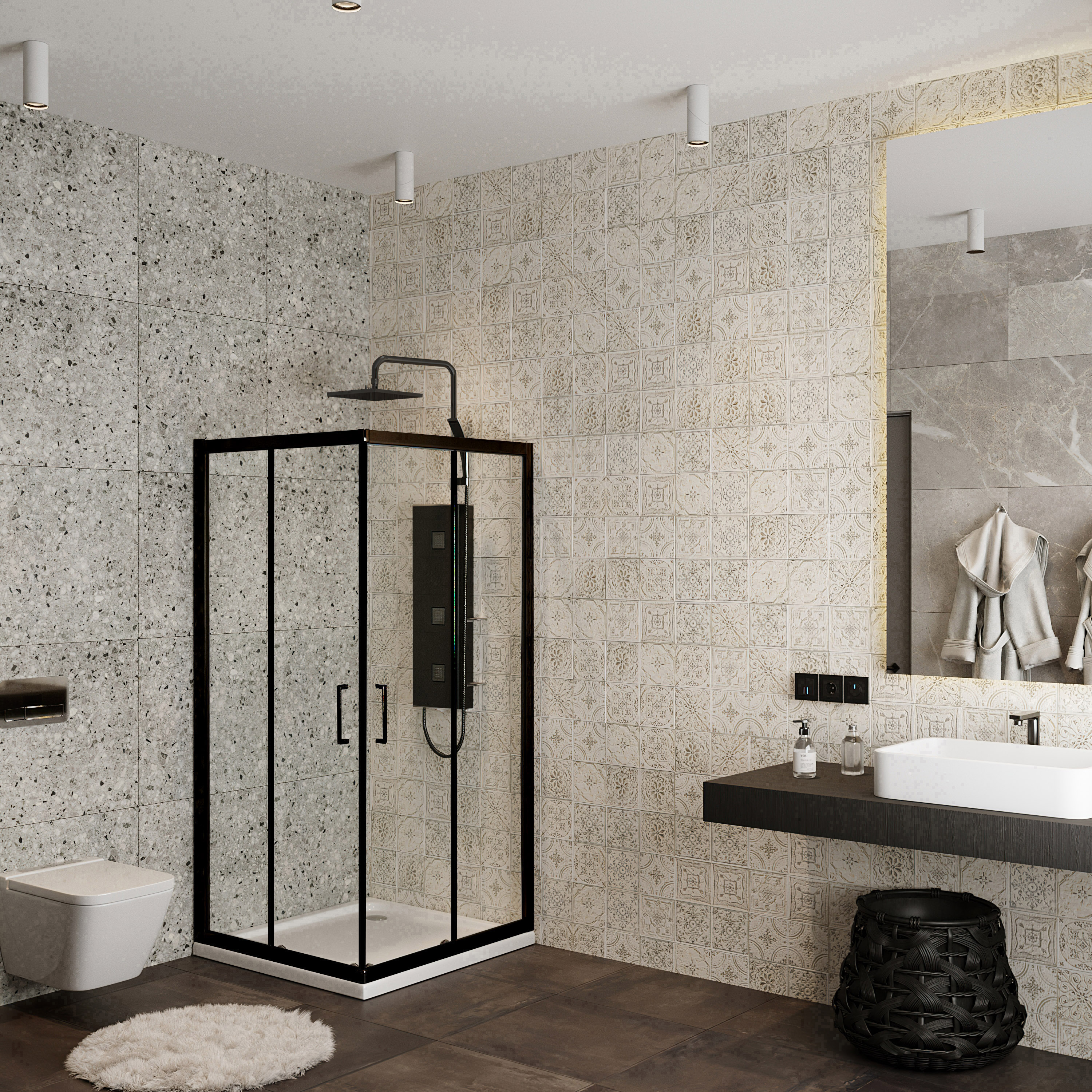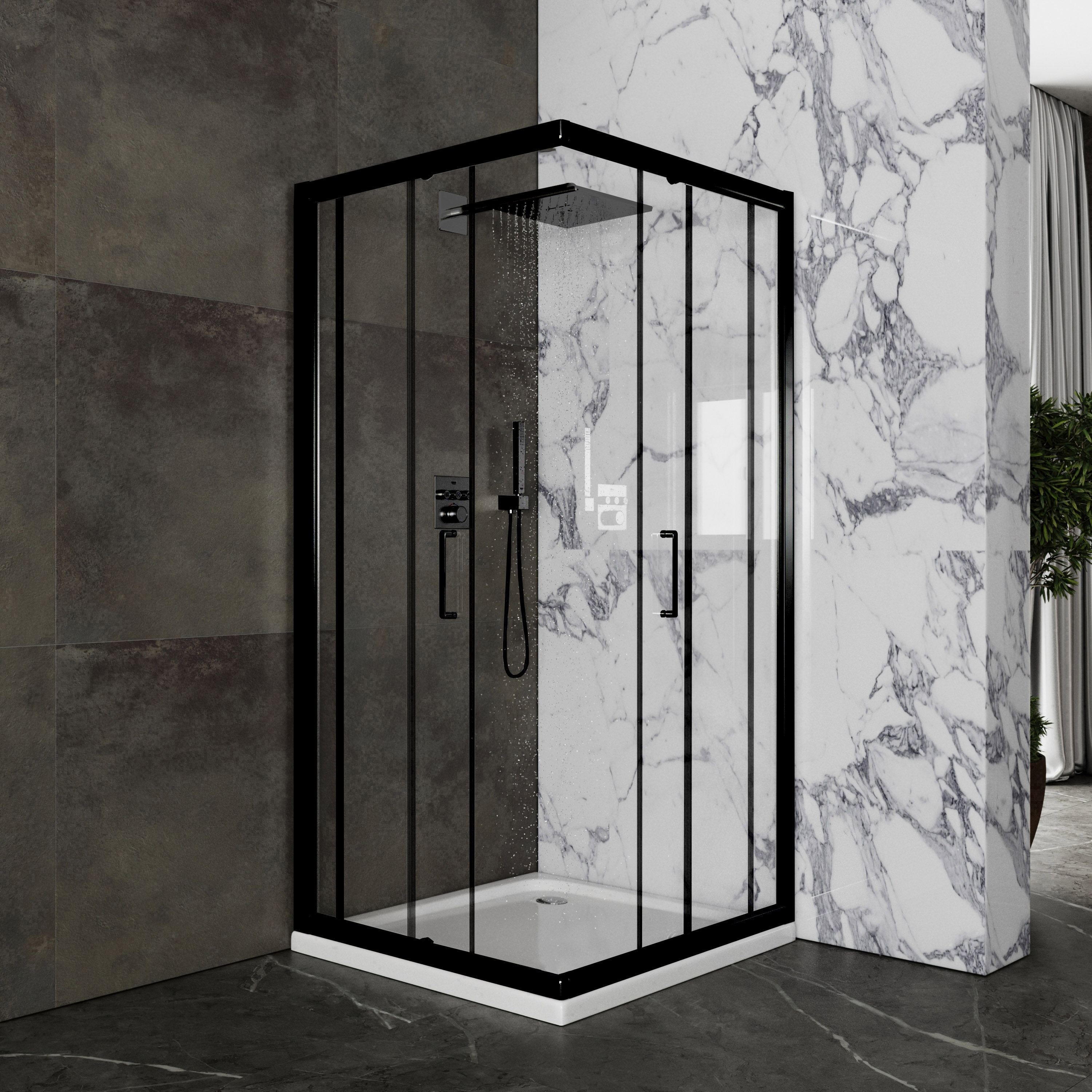 Душевой уголок Roxen Caspia с прозрачным стеклом и черным матовым профилем - душевое ограждение квадратной формы с раздвижными дверями. Конструкция уголка обеспечивает максимально широкий входной проем. Прочный профиль изготовлен из анодированного термостойкого алюминия со специальным покрытием DeepBlack, которое на долгие годы сохраняет насыщенный цвет изделия, предотвращает образование коррозии защищает от царапин. Герметичность уголка обеспечивают специальные силиконовые уплотнители. Удобные двойные ручки изготовлены из стали. Двойные металлические ролики на подшипниках обеспечивают мягкий ход, бесшумность и долгий срок службы. Ролики имеют специальные накладки, которые не только защищают от попадания лишней влаги и мелкого мусора, но и придают эстетичный вид. Так же все ролики оснащены специальными кнопками, нажатием которых вы можете отодвинуть створку и произвести уборку малодоступных частей кабины. Конструкция роликов и пазов, по которым они двигаются, предотвращает перекос и заедание подвижных частей уголка. Cпециальная технология EasyFix обеспечивает быстрый и надежный монтаж алюминиевых профилей изделия. Уголок имеет универсальную установку - на пол, оборудованный сливным трапом, душевой поддон или подиум.