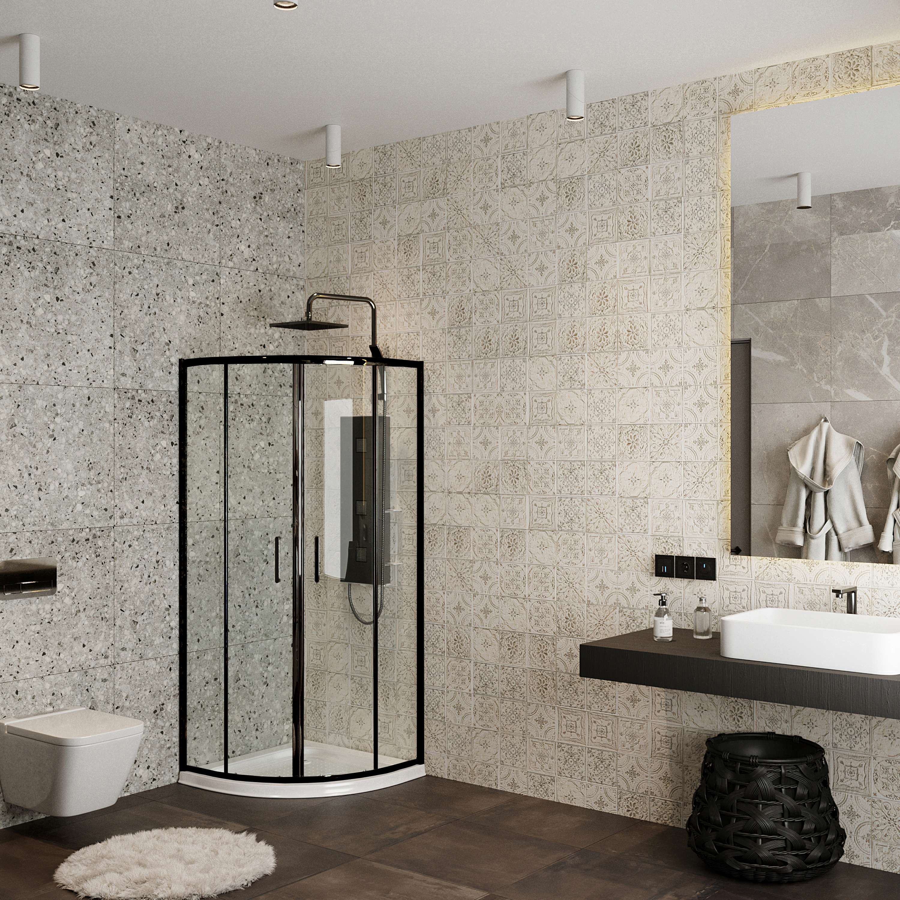 Душевой уголок Roxen Santi с прозрачными стеклами и черным матовым профилем - полукруглое душевое ограждение с раздвижными дверями. Прочный профиль изготовлен из анодированного термостойкого алюминия со специальным покрытием DeepBlack, которое на долгие годы сохраняет насыщенный цвет изделия, предотвращает образование коррозии защищает от царапин. Герметичность уголка обеспечивают специальные силиконовые уплотнители. Удобные двойные ручки изготовлены из стали. Двойные металлические ролики на подшипниках обеспечивают мягкий ход, бесшумность и долгий срок службы. Ролики имеют специальные накладки, которые не только защищают от попадания лишней влаги и мелкого мусора, но и придают эстетичный вид. Так же все ролики оснащены специальными кнопками, нажатием которых вы можете отодвинуть створку и произвести уборку малодоступных частей кабины. Конструкция роликов и пазов, по которым они двигаются, предотвращает перекос и заедание подвижных частей уголка. Cпециальная технология EasyFix обеспечивает быстрый и надежный монтаж алюминиевых профилей изделия. Уголок имеет универсальную установку - на пол, оборудованный сливным трапом, душевой поддон или подиум.