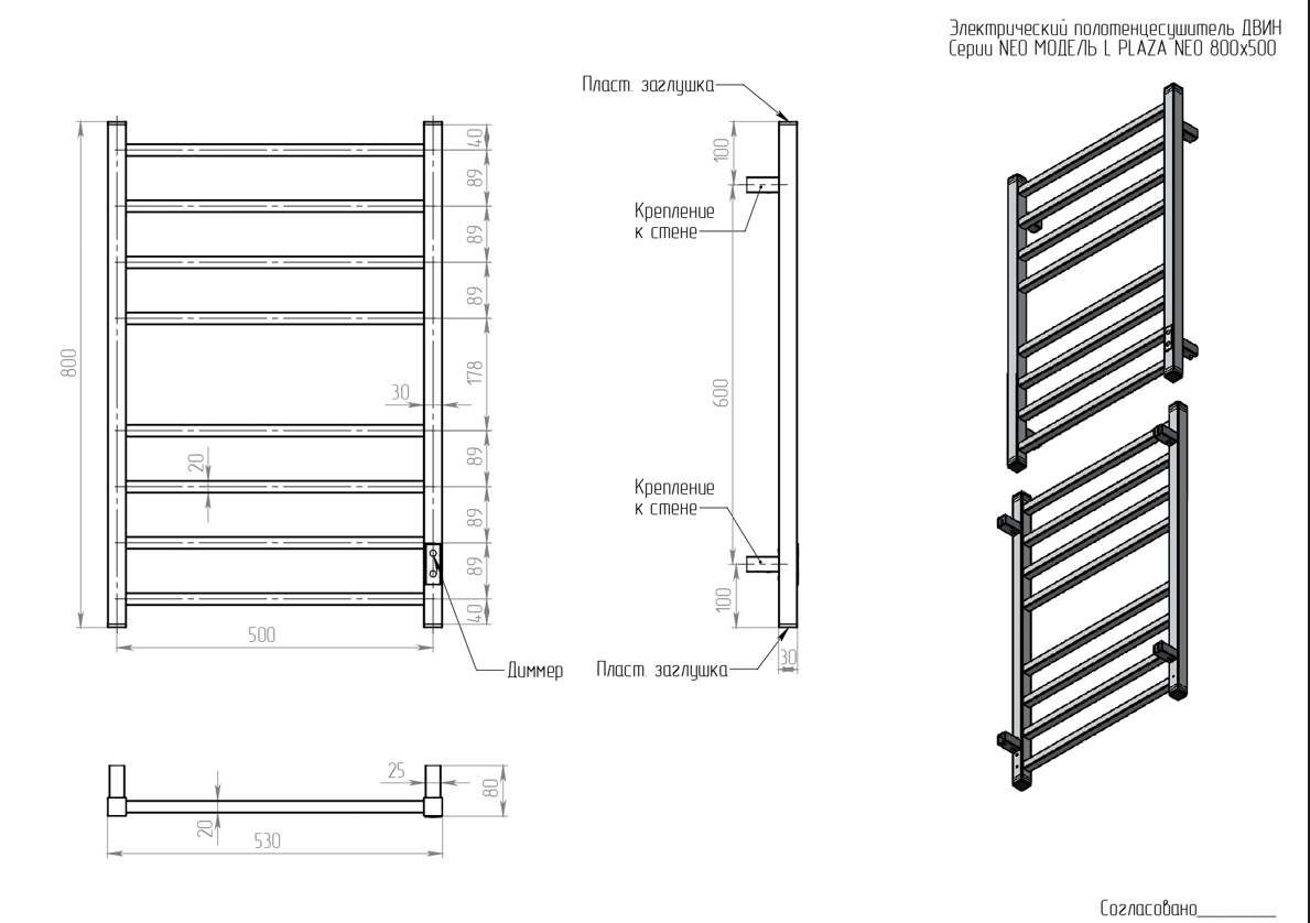 Электрический полотенцесушитель ДВИН из квадратного профиля с квадратными перекладинами L plaza с димером из серии "NEO"