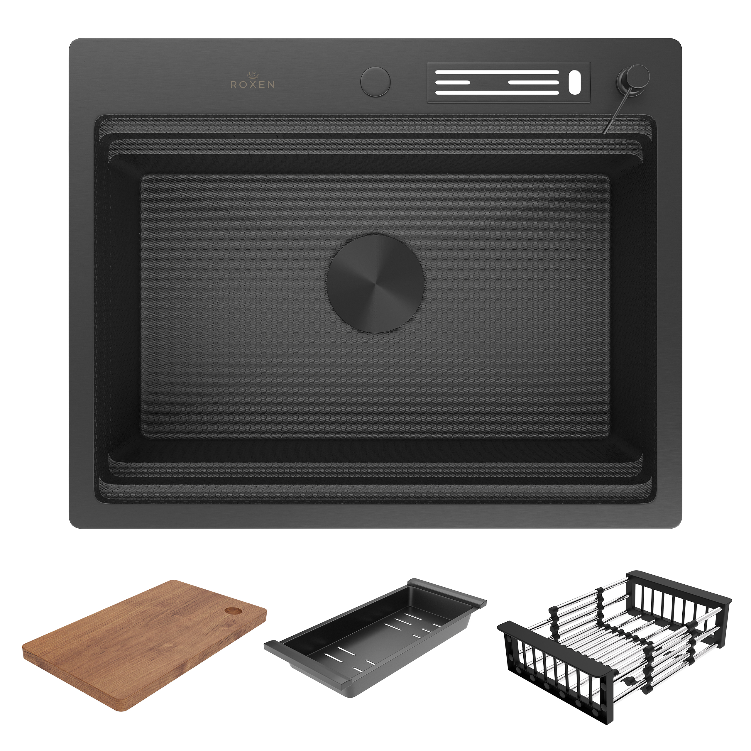 Кухонная мойка Roxen Stage 60-BS (графит) в комплекте с держателем для ножей, двумя коландерами, разделочной доской и дозатором - это удобная модель с глубокой чашей в цвете графит, сочетает в себе стильный современный дизайн, функциональность и отличные эксплуатационные характеристики. Удобная вместительная чаша дает возможность расположить коландеры на двух уровнях. Держатель для ножей имеет водоотводящую коробку, что поможет ножам всегда оставаться сухими и продлить срок их службы. Мойка изготовлена из аустенитной низкоуглеродистой стали марки AISI 304, которая обладает устойчивостью к коррозии, окислению и перепаду температур. Отличные шумопоглощающие характеристики мойки обеспечиваются шумоподавляющим составом Silent Protection и шумопоглощающими пластинами Soft Silence, которые располагаются по всей чаше мойки.