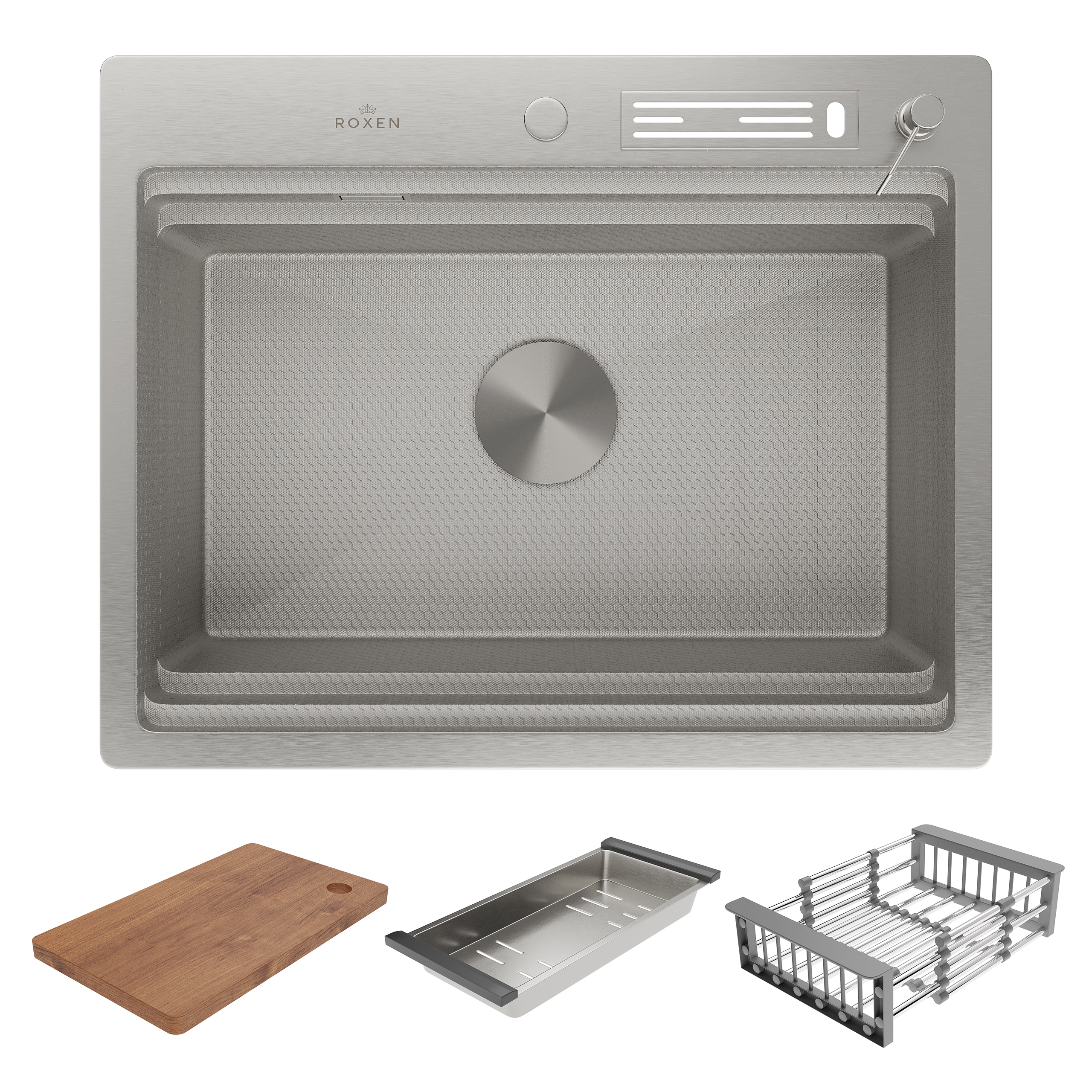 Кухонная мойка Roxen Stage 60-S в комплекте с держателем для ножей, двумя коландерами, разделочной доской и дозатором - это удобная модель с глубокой чашей, сочетает в себе стильный современный дизайн, функциональность и отличные эксплуатационные характеристики. Удобная вместительная чаша дает возможность расположить коландеры на двух уровнях. Держатель для ножей имеет водоотводящую коробку, что поможет ножам всегда оставаться сухими и продлить срок их службы. Мойка изготовлена из аустенитной низкоуглеродистой стали марки AISI 304, которая обладает устойчивостью к коррозии, окислению и перепаду температур. Уникальное покрытие Bruch Tech является защитным слоем, устойчивым к истиранию, появлению царапин и механических повреждений. Отличные шумопоглощающие характеристики мойки обеспечиваются шумоподавляющим составом Silent Protection и шумопоглощающими пластинами Soft Silence, которые располагаются по всей чаше мойки.