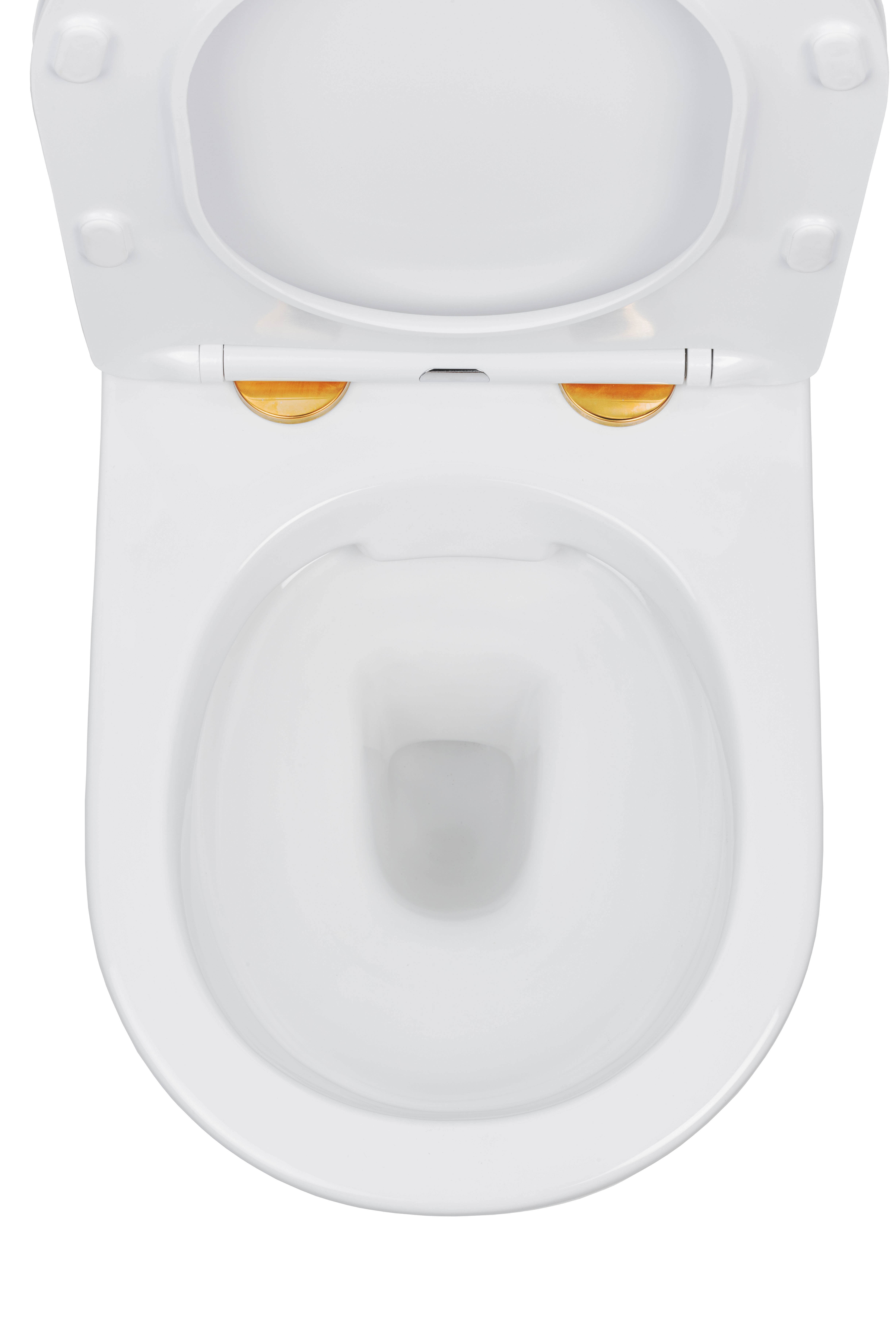 Подвесной унитаз Roxen Antares Gold 530110-01G Rimless Soft Close - компактная модель с удобной округлой безободковой чашей Pro-Rimless, благодаря чему нет труднодоступных зон для уборки. Изготовлен из санитарного фарфора Porcelain, который обеспечивает прочность изделия, белизну, абсолютно гладкую поверхность, отсутствие пор и углублений. Специальное антибактериальное покрытие Ultra Glide обеспечивает легкий уход, гигиеничность и первоначальный внешний вид на долгие годы. Инновационная конструкция чаши унитаза позволяет избежать попадания брызг воды при смыве. Модель укомплектована тонким быстросъемным сиденьем с крышкой Soft Close (плавное опускание).