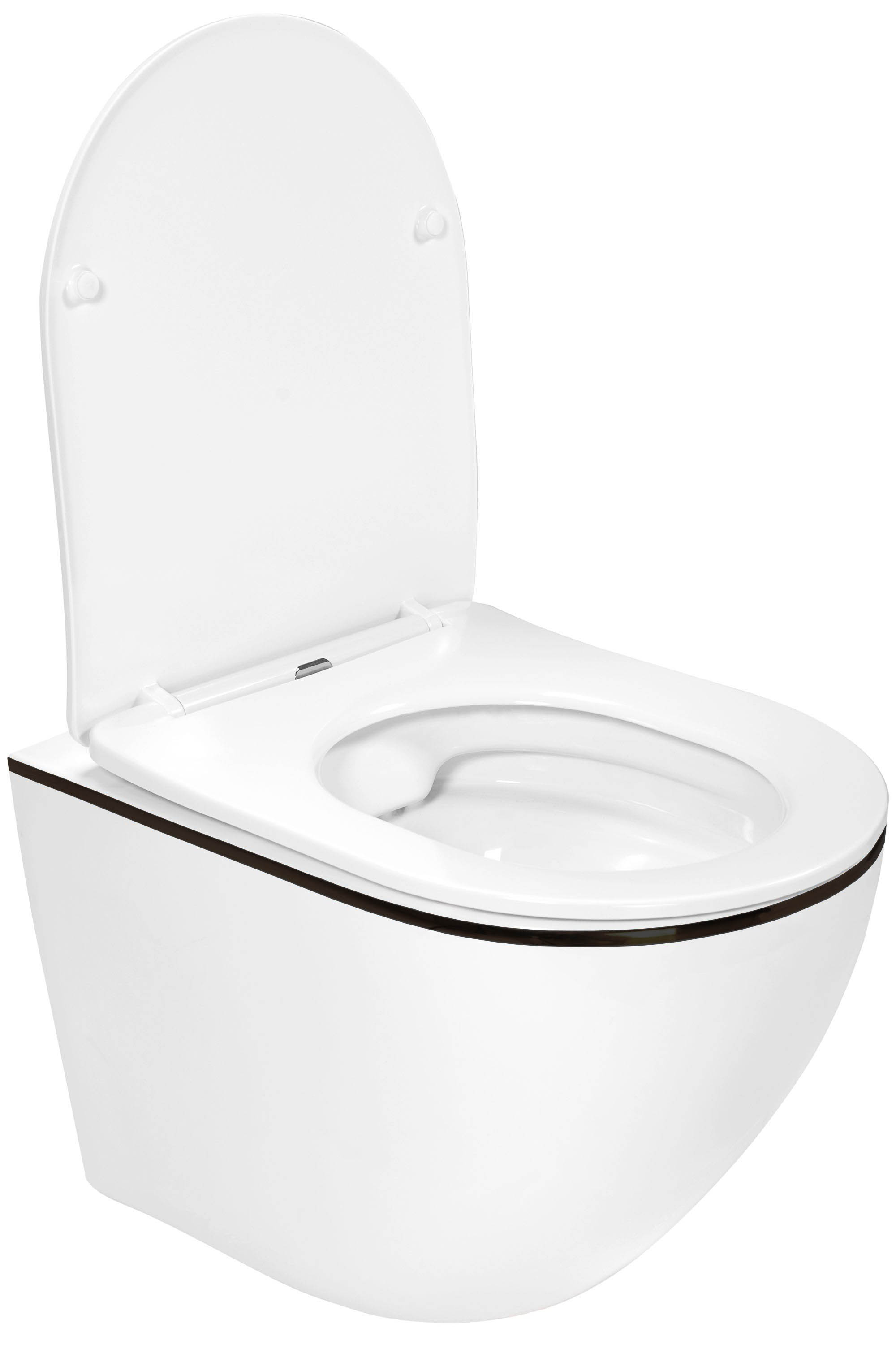 Подвесной унитаз Roxen Antares Black 530110-01B Rimless Soft Close - стильная модель с черной окантовкой и с удобной округлой безободковой чашей Pro-Rimless, благодаря чему нет труднодоступных зон для уборки. Изготовлен из санитарного фарфора Porcelain, который обеспечивает прочность изделия, белизну, абсолютно гладкую поверхность, отсутствие пор и углублений. Специальное антибактериальное покрытие Ultra Glide обеспечивает легкий уход, гигиеничность и первоначальный внешний вид на долгие годы. Инновационная конструкция чаши унитаза позволяет избежать попадания брызг воды при смыве. Модель укомплектована тонким быстросъемным сиденьем с крышкой Soft Close (плавное опускание).