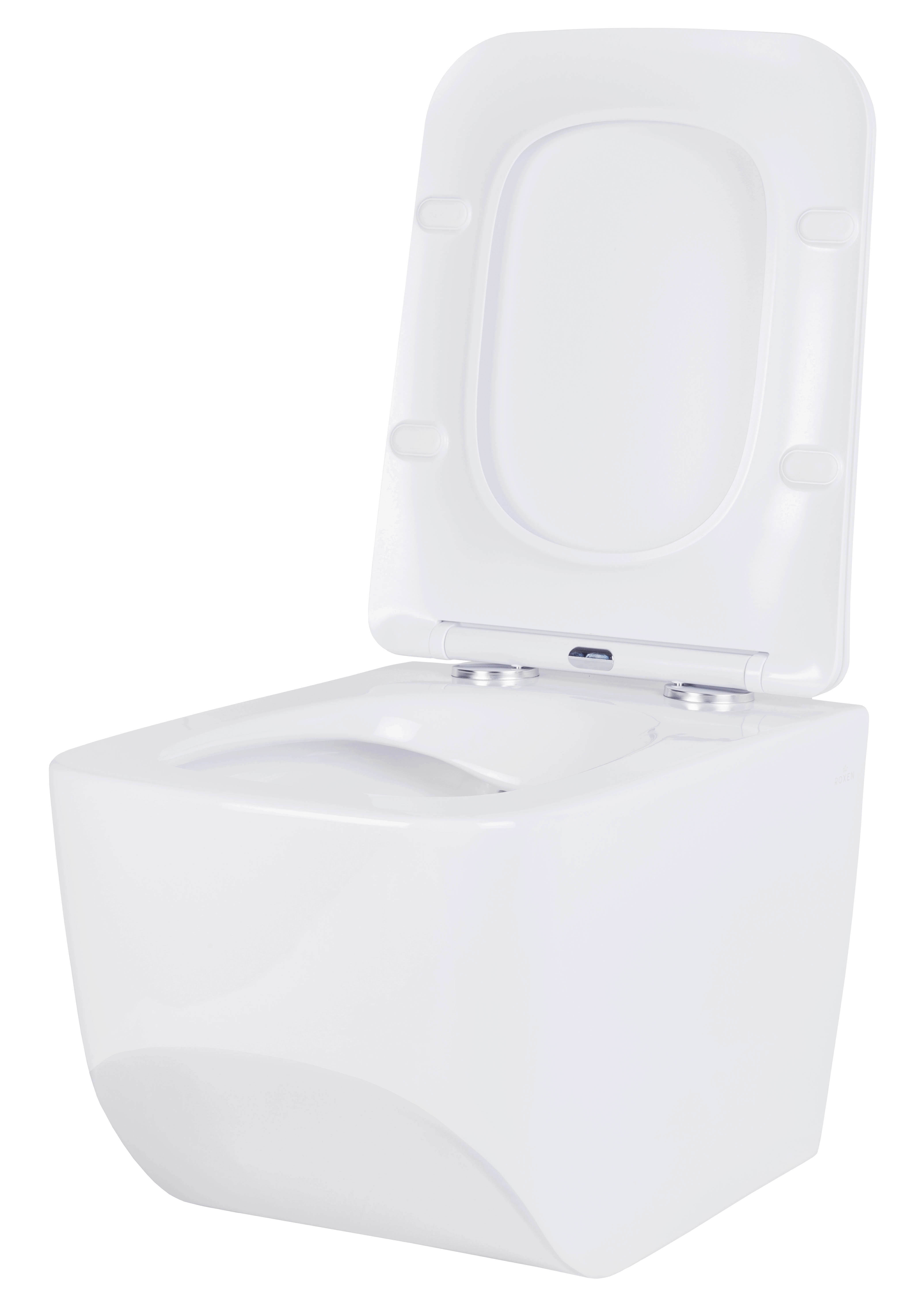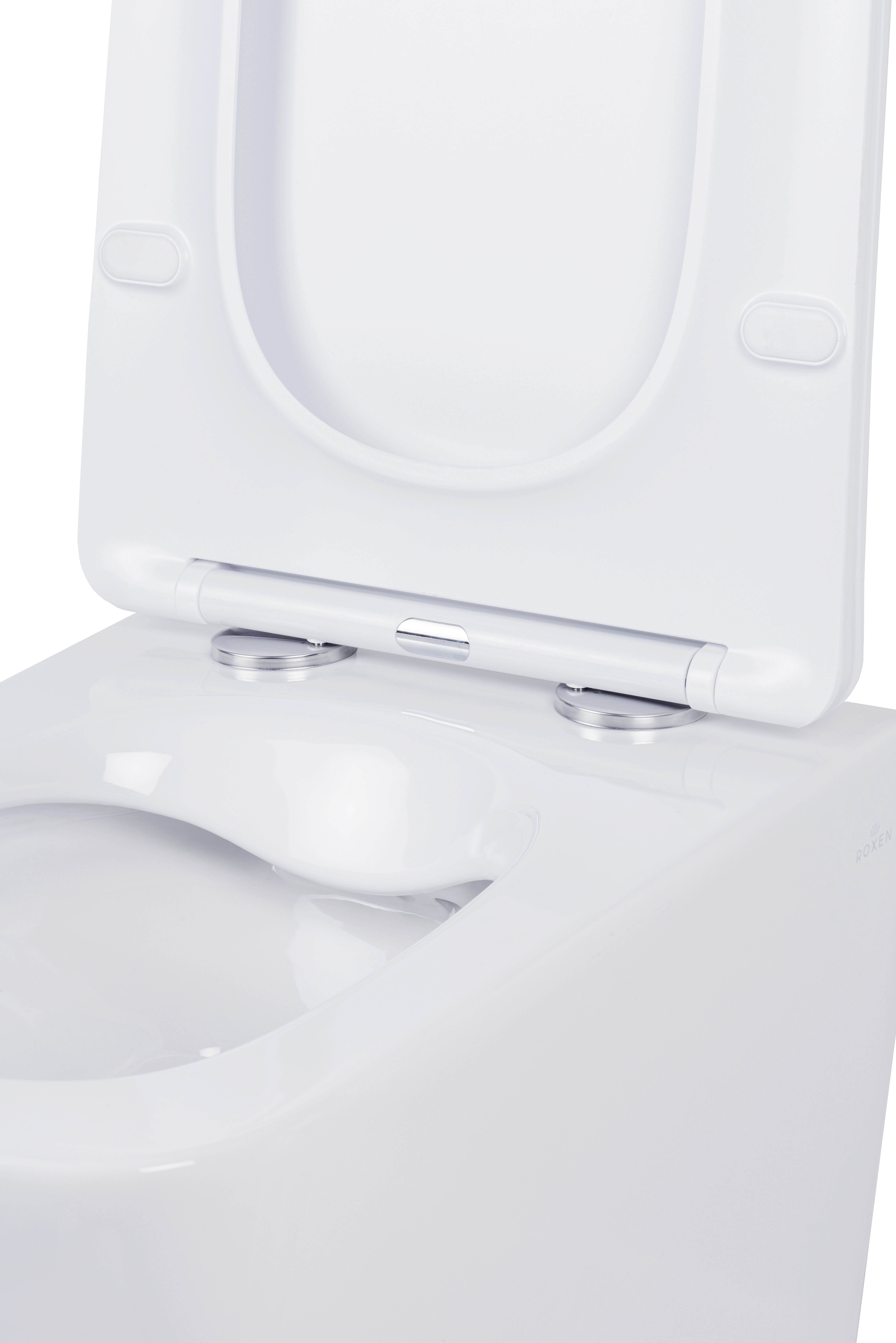 Подвесной унитаз Roxen Boro 530145-01 Rimless Soft Close - стильная оригинальная модель с удобной безободковой чашей Pro-Rimless, благодаря чему нет труднодоступных зон для уборки. Инновационная конструкция чаши унитаза позволяет избежать попадания брызг воды при смыве. Изготовлен из санитарного фарфора Porcelain, который обеспечивает прочность изделия, белизну, абсолютно гладкую поверхность, отсутствие пор и углублений. Специальное антибактериальное покрытие Ultra Glide обеспечивает легкий уход, гигиеничность и первоначальный внешний вид на долгие годы. Модель укомплектована тонким быстросъемным сиденьем с крышкой Soft Close (плавное опускание).